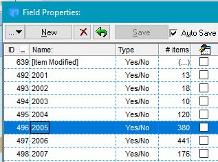Here you can see that I have some fields in my database with numerical names, e.g. 2004, 2005, etc.: There are 380 items for which the field "2005" = Yes.