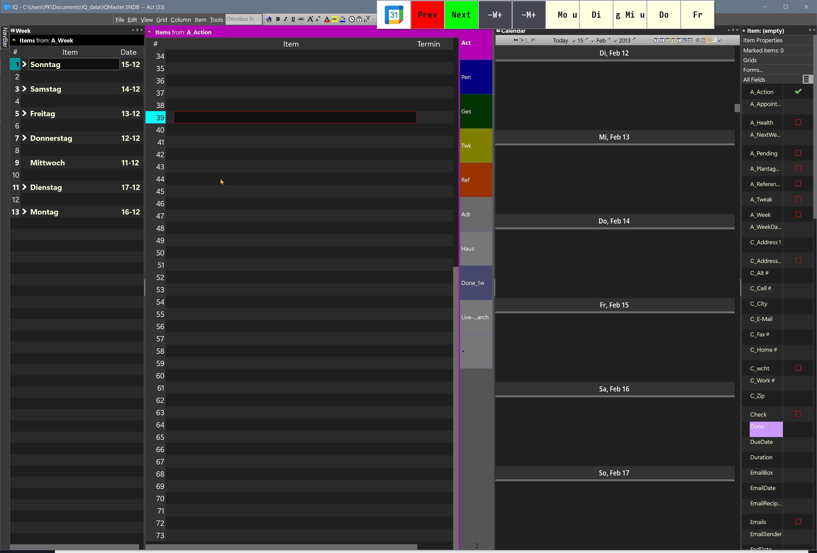 By the way, the bar at the top right was made with PowerPro by Bruce Switzer, a nifty tool. Clicking on the bar's buttons sends customized commands to InfoQube or other programs. The leftmost button, for example, opens a monthly view of Google calendar (synced with IQ) in the browser. The red and the green one allow me to go back and forth between positions I visited in InfoQube. The dark grey ones are just larger versions of IQ's calendar controls. The remaining ones enter certain templates of items in the current grid.