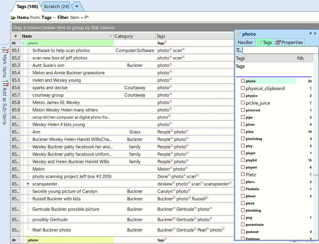 Anyway, I can just stick with my idiosyncratic system for now. (I've tried to use Visual Basic to automate making items into children of their tags, but no luck so far)