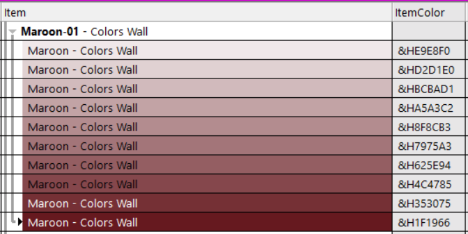 I also have a color reference grid where I have many more colors captured online. For these, you just copy the value in ItemColor and paste it in the ItemColor field next to the item you want to color: